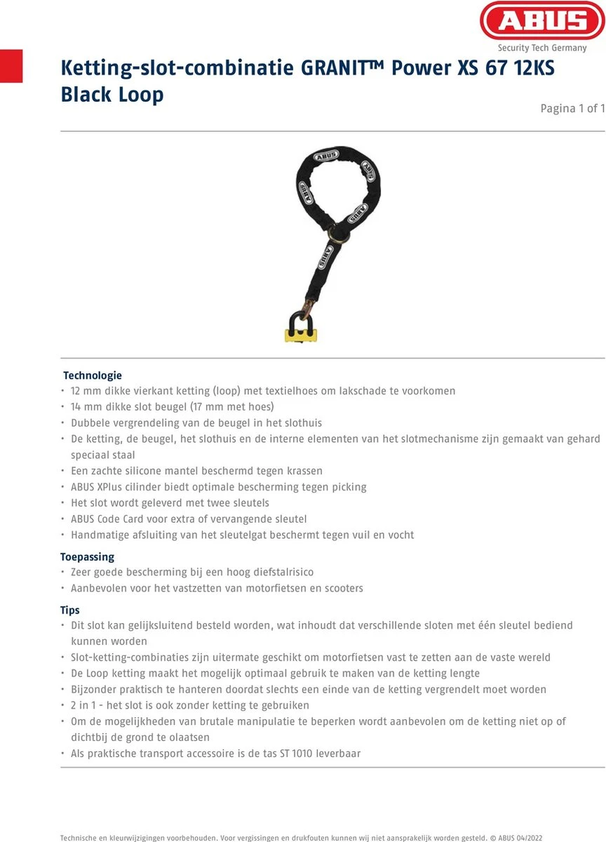 | Verpakkingsinhoud | ABUS Granit 67/12 Kettingslot + Loop ART 4 – 120 cm |