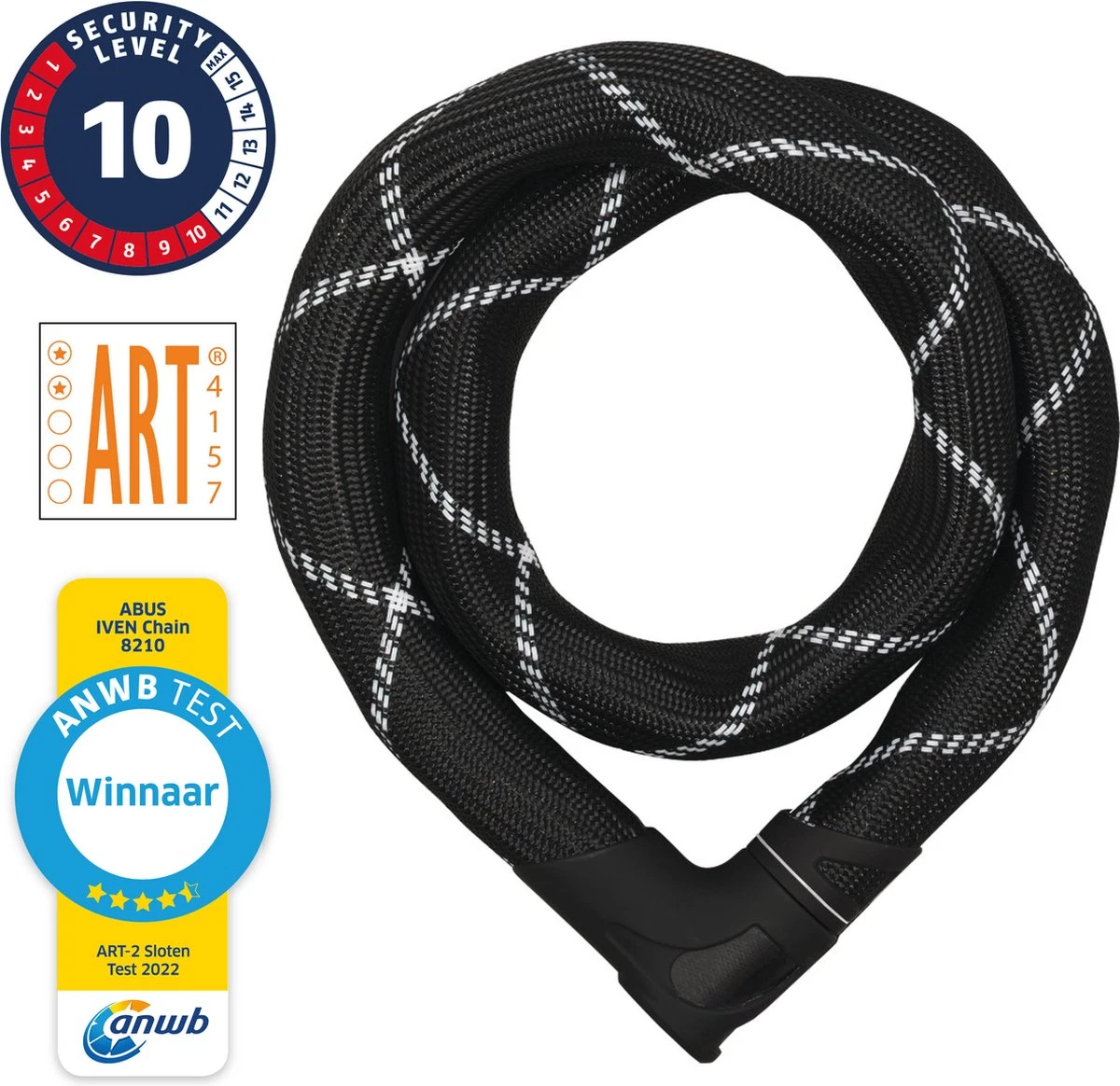 De ABUS Iven 8210 is een hoogwaardig kettingslot met een ABUS security level van 10 en een ART 2 keurmerk. Dit betekent dat je hiermee je fiets kunt verzekeren tegen diefstal. Daarnaast is de Iven 8210 winnaar van de ANWB slotentest 2022 in de categorie ART 2 gekeurde sloten.