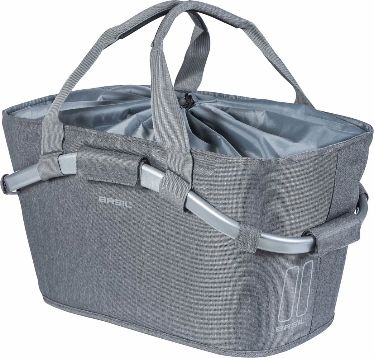 De Basil Classic Carry All Rear Basket is een echte design fietsmand in een zwarte kleur. Hij is geschikt voor een damesfiets. De lichtgewicht fietsmand bevestig je eenvoudig op je bagagedrager. Ook op bagagedragers van elektrische fietsen. De shopping mand wordt inclusief MIK Adapterplate geleverd. De mand met voorgemonteerde plaat klik je eenvoudig in je MIK systeemdrager of een MIK Carrierplate. De Basil Classic Carry All Rear Basket is makkelijk afneembaar en neem je dus heel handig mee de winkel in. Ideaal voor al je boodschappen! Met het aansnoerkoord houd je vervolgens de boodschappen op hun plek. Dankzij de aluminium beugel met curve kun je een afschuining aan zadelzijde maken. Zo kun je comfortabel fietsen! De afgeschuinde zorgt ervoor dat de fietsmand zover mogelijk naar je zadel – maar er niet tegenaan!- bevestigd kan worden. De mand is gemaakt van waterafstotend polyester en beschikbaar in vijf dessins. Wil je de achtermand combineren met een mandje voorop? Dat kan! In hetzelfde materiaal en dezelfde kleur hebben wij ook een mandje voor voorop: Basil Classic Carry all basket KF blauw Eigenschappen: Met een inhoud van 22 liter neem je veel boodschappen mee. Inclusief binnenvak en aansnoerkoord. Perfect geschikt voor een E-bike! Inclusief MIK-adapterplaat en MIK-stick. Geschikt voor MIK systeemdragers en carrierplates (apart verkrijgbaar).