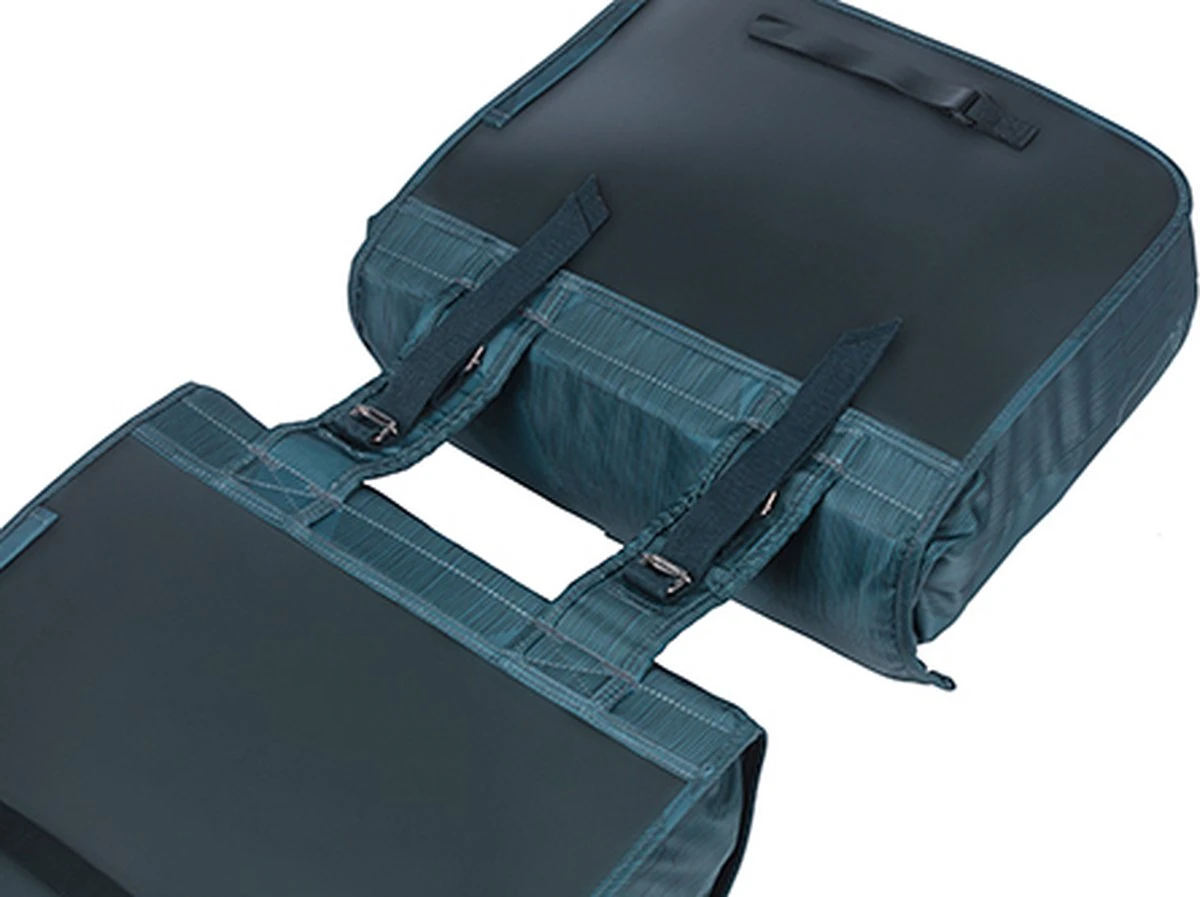 De tas is gemaakt van waterafstotend materiaal en dankzij de waterkerende vouwsluitingen blijft de inhoud van je tas droog mocht er plotseling een klein regenbuitje vallen. Je sluit de tas eenvoudig met de sterke klittenbandsluiting. Iets zwaars vervoeren? Dat is geen probleem omdat de bodem van de dubbele fietstas is verstevigd met een glas fiber strip.