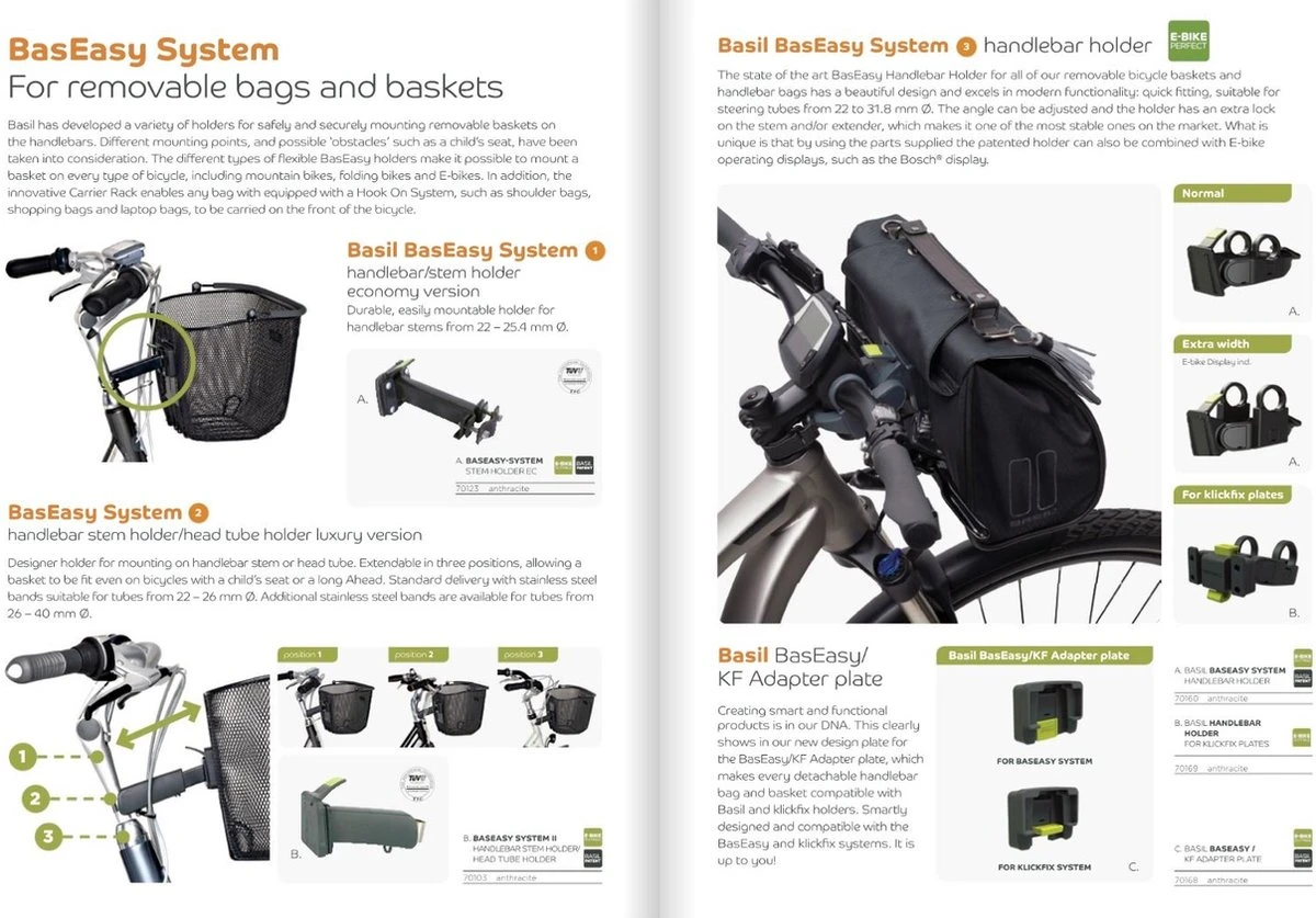 De Basil KF Handlebar Holder is handig hulpmiddel voor het bevestigen van een afneembare fietsmand of stuurtas. Deze stuurbochthouder kun je combineren met fietsaccessoires die voorzien zijn van een: Basil KF Adapterplaat Basil BasEasy/KF Adapterplaat Het systeem bevestig je aan de stuurbocht van je fietsstuur. De houder past ook de meeste stadsfietsen, of dat nu dames- of herenfietsen zijn. Daarnaast is de stuurbochthouder ook geschikt voor E-bikes met bijvoorbeeld een Bosch display. Dankzij die meegeleverde verbredingselementen, monteer je de houder ook op stuurbochten waar een display op zit. De Basil KF Handlebar holder is geschikt voor stuurbochten van 22-31.8 mm Ø;. De houder is gemaakt van kunststof en monteer je snel en eenvoudig. De hoek van de houder is verstelbaar en dankzij de montage zit de houder zeer stabiel. Eigenschappen: De Basil KF Handlebar holder is verkrijgbaar in het zwart. De stuurbochthouder is geschikt voor KF adapterplaten. Ook te gebruiken in combinatie met E-bike displays (o.a. Bosch). De houder is zeer stabiel in verband met een extra borging.