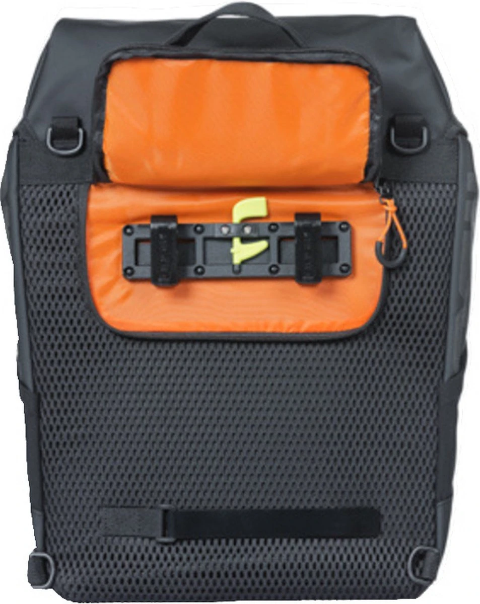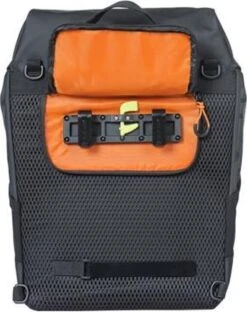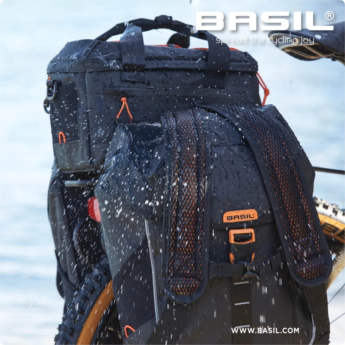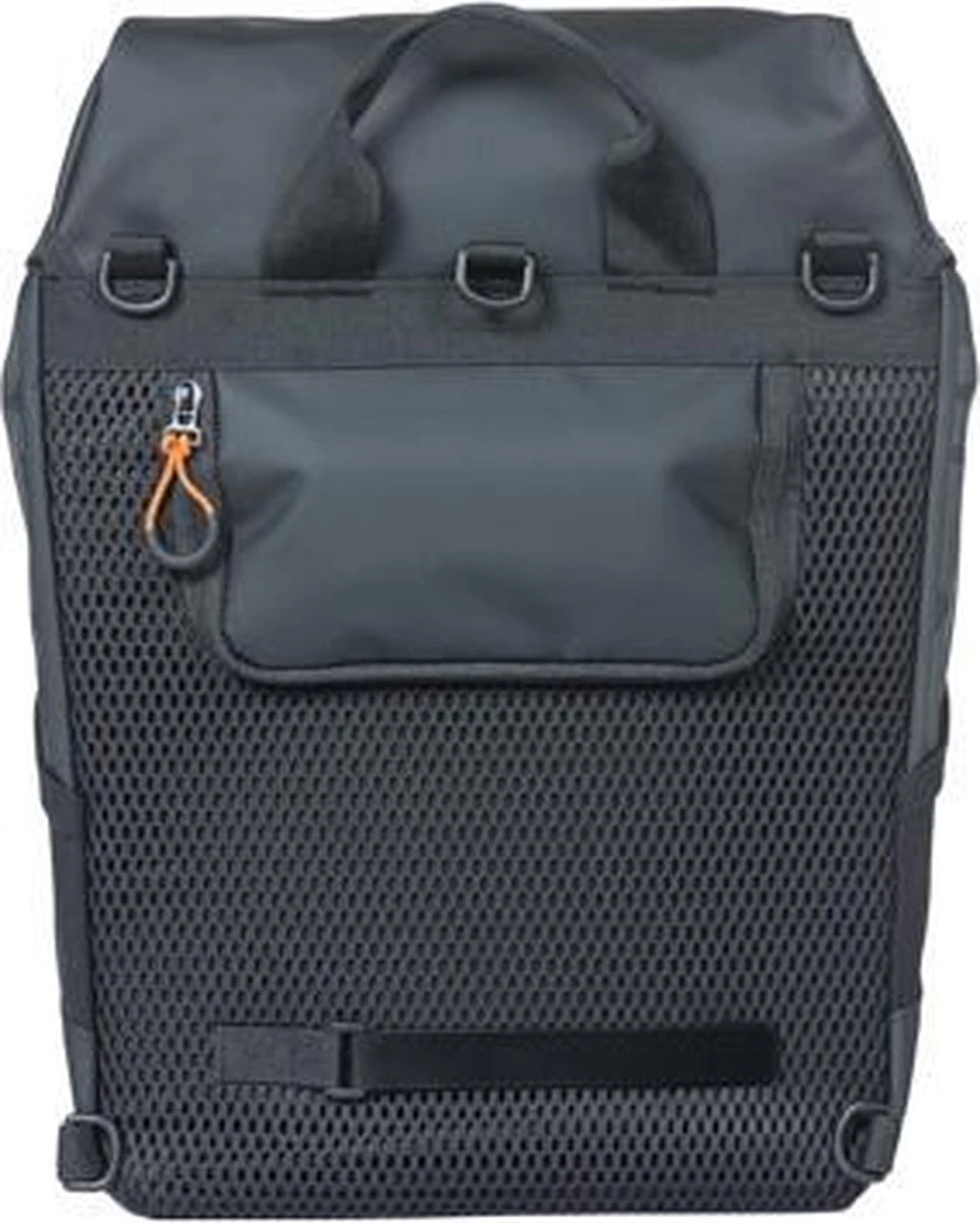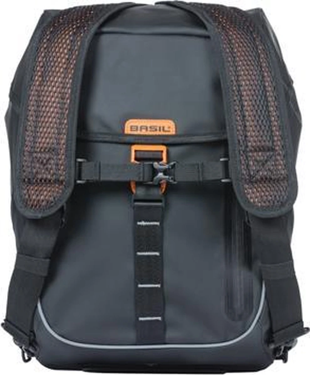 Is het een rugzak? Is het een fietstas? Nee, het is een fietsrugtas! Deze handige en sportieve tas haak je met het Hook-On systeem gemakkelijk aan je bagagedrager. Wil je offroad te voet de natuur intrekken, dan draag je de rugzak comfortabel op je rug. De fietsrugzak heeft een gewatteerd achterpand en gewatteerde schouderbanden. Doordat je de Basil Miles Tarpaulin fietsrugzak aan je bagagedrager meeneemt, voorkom je dat je zweterig op je bestemming aankomt. En omdat het gewicht van de tas een stuk lager zit, fiets je veel stabieler (en daarmee veiliger). Ideaal voor als je een korte of lange recreatieve fietstocht wilt maken. Of als je op fietsvakantie wilt gaan. Gemaakt van waterdicht matzwart Tarpaulin. De waterdichte tas heeft een roltopsluiting en getapete naden, en kan dus tegen een flinke regenbui. Jouw spullen blijven tijdens het fietsen dus droog. In de diverse vakken berg je makkelijk je spullen op. Ideaal voor je boeken, smartphone, pennen. De fietsrugzak heeft op alle zijden reflectie. Eigenschappen: Fietstas en rugtas in één! Gemaakt van waterdicht Tarpaulin met roltopsluiting. Bevestiging aan bagagedrager met Hook-On systeem. Perfect voor E-bikes.