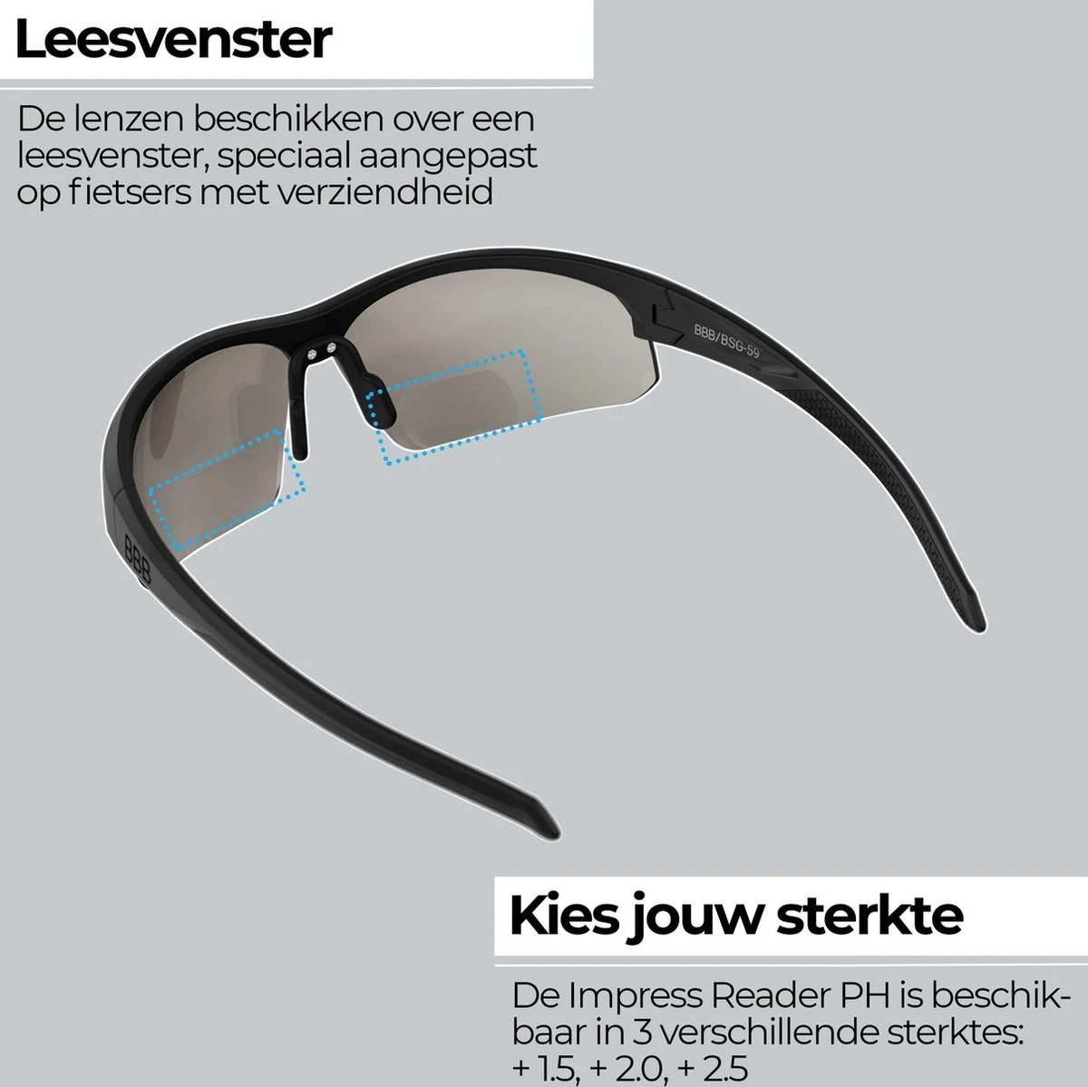 De BBB Cycling BSG-59PH Impress Reader PH fietsbril is ideaal voor de sporter die behoefte heeft aan een leesgedeelte in zijn sportbril. De bril is lichtgewicht en heeft een perfect instelbaar rubberen neusstuk. De lenzen hebben een lichtdoorlatendheid van 85-17%. Hoe feller het licht, hoe donkerder de lens wordt. Ook verkrijgbaar als versie met zonnelens en verwisselbare transparante lens (BSG-59 Impress Reader).