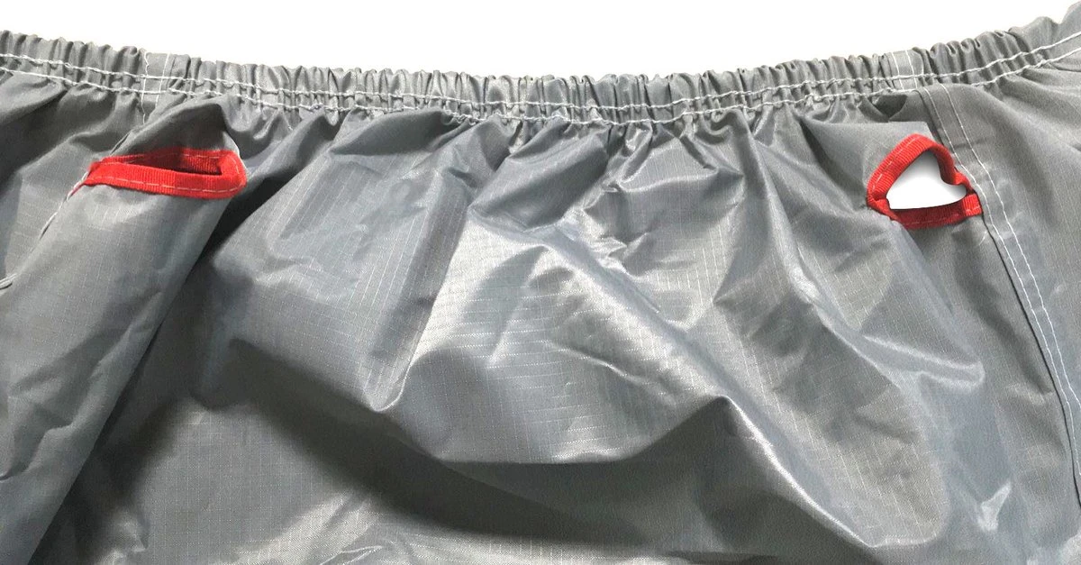 De voorkant van de hoes is dichter bij elkaar gestikt waardoor het goed passend is om het voorwiel heen. Achter is hij tevens wat dichter op elkaar gestikt zodat hij lekker over het achterwiel te halen is. De hoes is zo gemaakt dat het klapperen van de hoes in de wind maximaal wordt beperkt. De Gazelle Makki Load wordt zo uitermate goed beschermd.