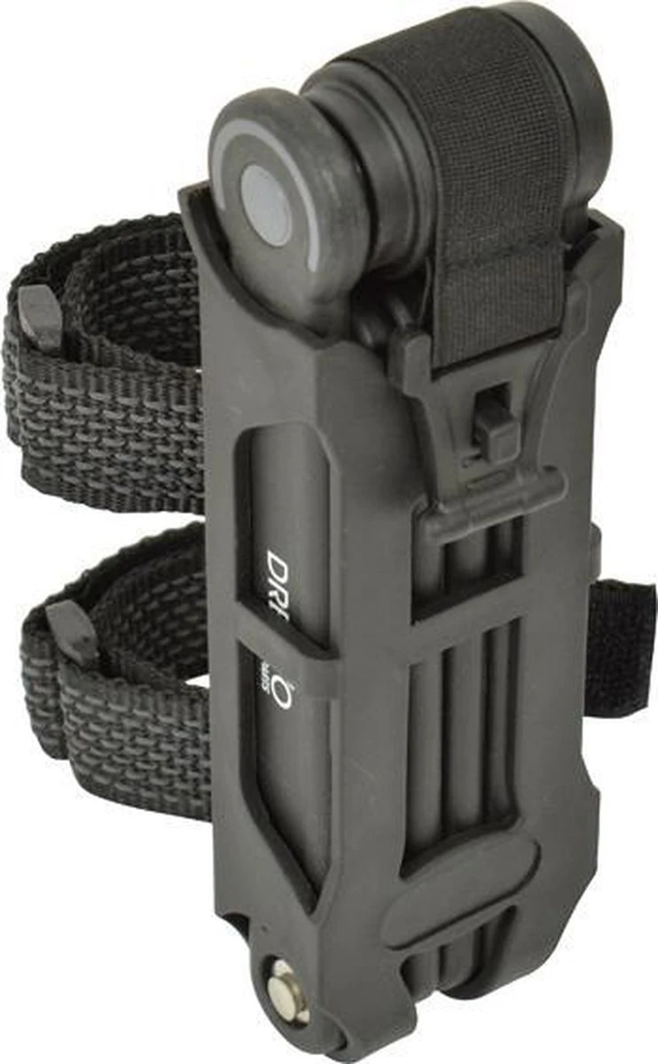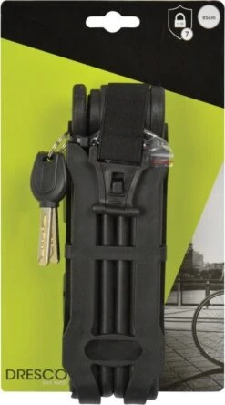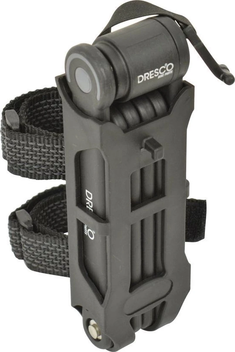 Het Dresco vouwslot met sleutel is een uniek compact slot door zijn scharnierconstructie. Het slot heeft een lengte van 85 centimeter en heeft 5,5 millimeter dikke geharde elementen. Het slot heeft zes elementen die met elkaar verbonden zijn, elk met een lengte van 19 cm. Daarnaast heeft het slot een praktische houder om het slot aan het frame, door middel van klittenband, te bevestigen en te vervoeren. Of monteer, indien aanwezig, de houder met de meegeleverde bouten in de bidonbevestiging in het frame. Het slot wordt geleverd inclusief twee veiligheidssleutels.