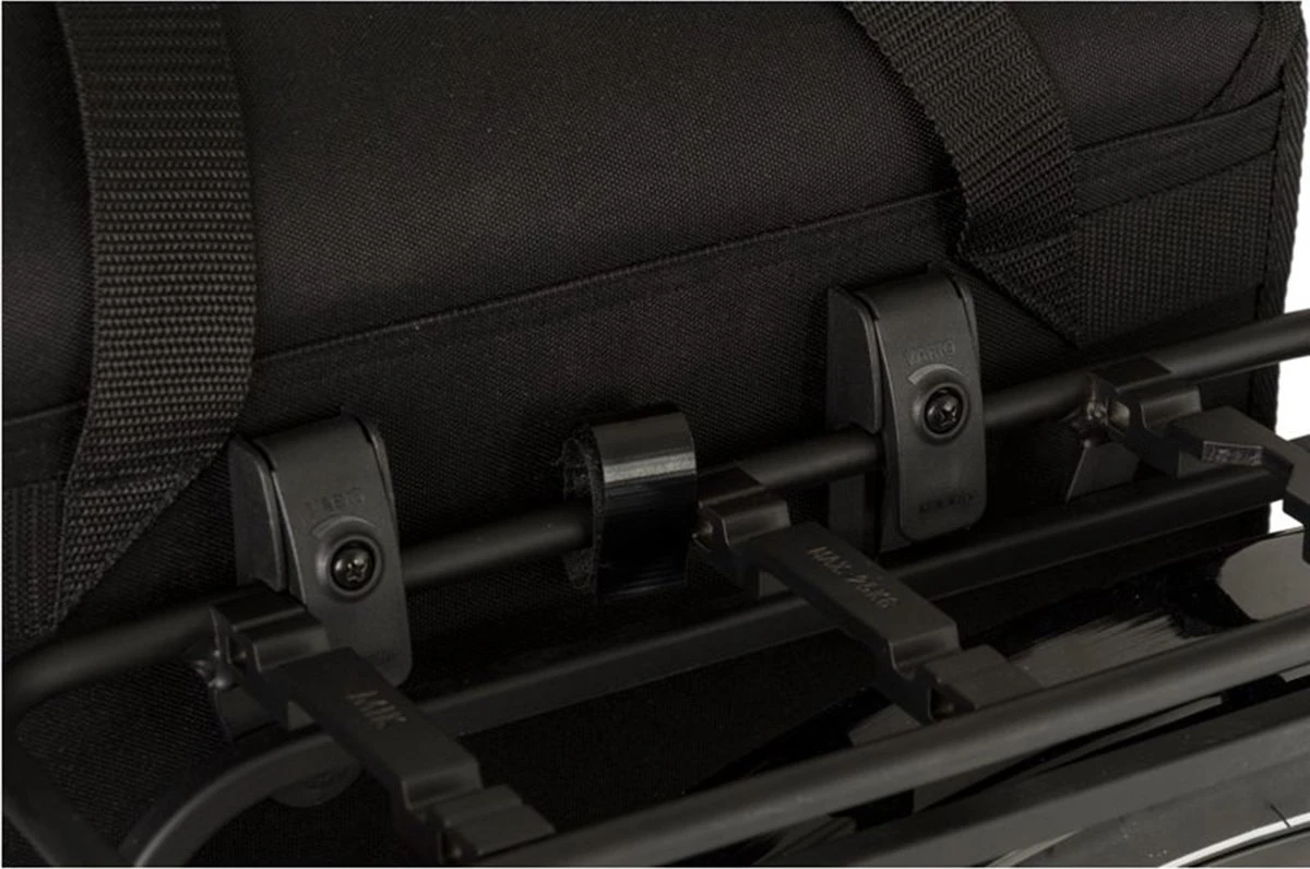 De Fastrider Luxe Shopper Enkele Fietstas beschikt over de KLICKfix E-Bike Vario hooks. Deze haken zijn speciaal gemaakt om beter tussen de kleine ruimte tussen bagagedrager en de accu te passen. Controleer wel of er voldoende ruimte zitten tussen de bagagedrager en accu, de KLICKfix E-Bike Vario Hooks hebben een maximale dikte op het dikste punt van 5mm. Verder is de hoogte 2,5 cm en is hij geschikt voor een diameter van 8-16mm.