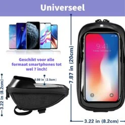 Met een extra opbergvak en driedimensionaal ontwerp ga je slim bepakt op weg. Zo is er nog ruimte voor een extra powerbank, pasjes, geld en een sleutelbos in jouw nieuwe fietstas en geniet je van optimaal gemak. Kun je op een zonnige dag het scherm niet goed zien? Jouw nieuwe smartphone houder voorkomt directe zonlicht reflectie!. Muziek luisteren tijdens het fietsen? Met een ingebouwde opening voor jouw headset kun je van jouw favoriete playlist tijdens een fietstocht genieten. De telefoonhouder kan 360 graden roteren. Hierdoor kun je jouw telefoon zowel in portret- als landschap stand gebruiken. Verzegelde dubbele ritssluiting Zorgt ervoor dat het water niet in de zak stroomt en maakt het gemakkelijk te openen en te sluiten.