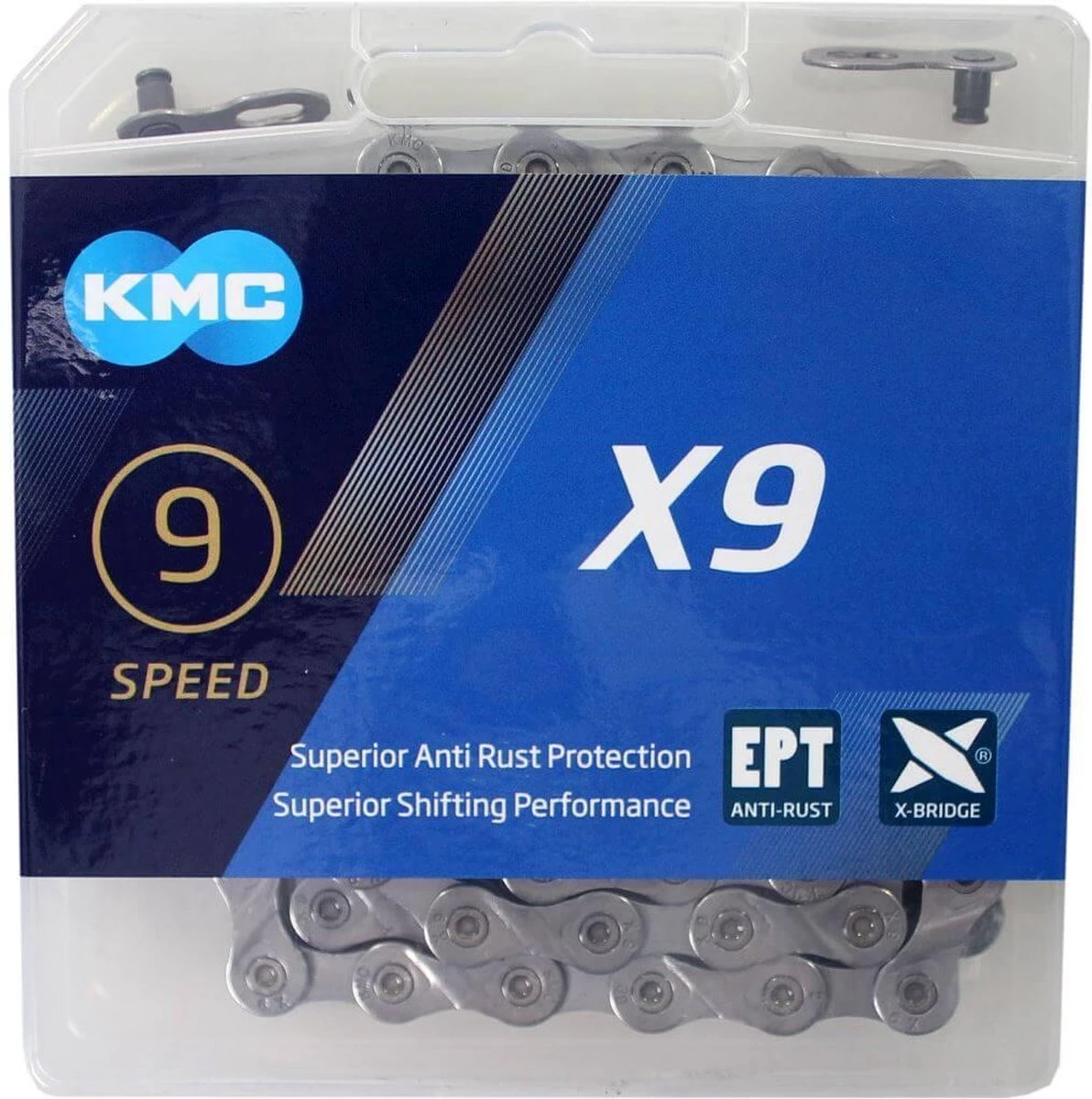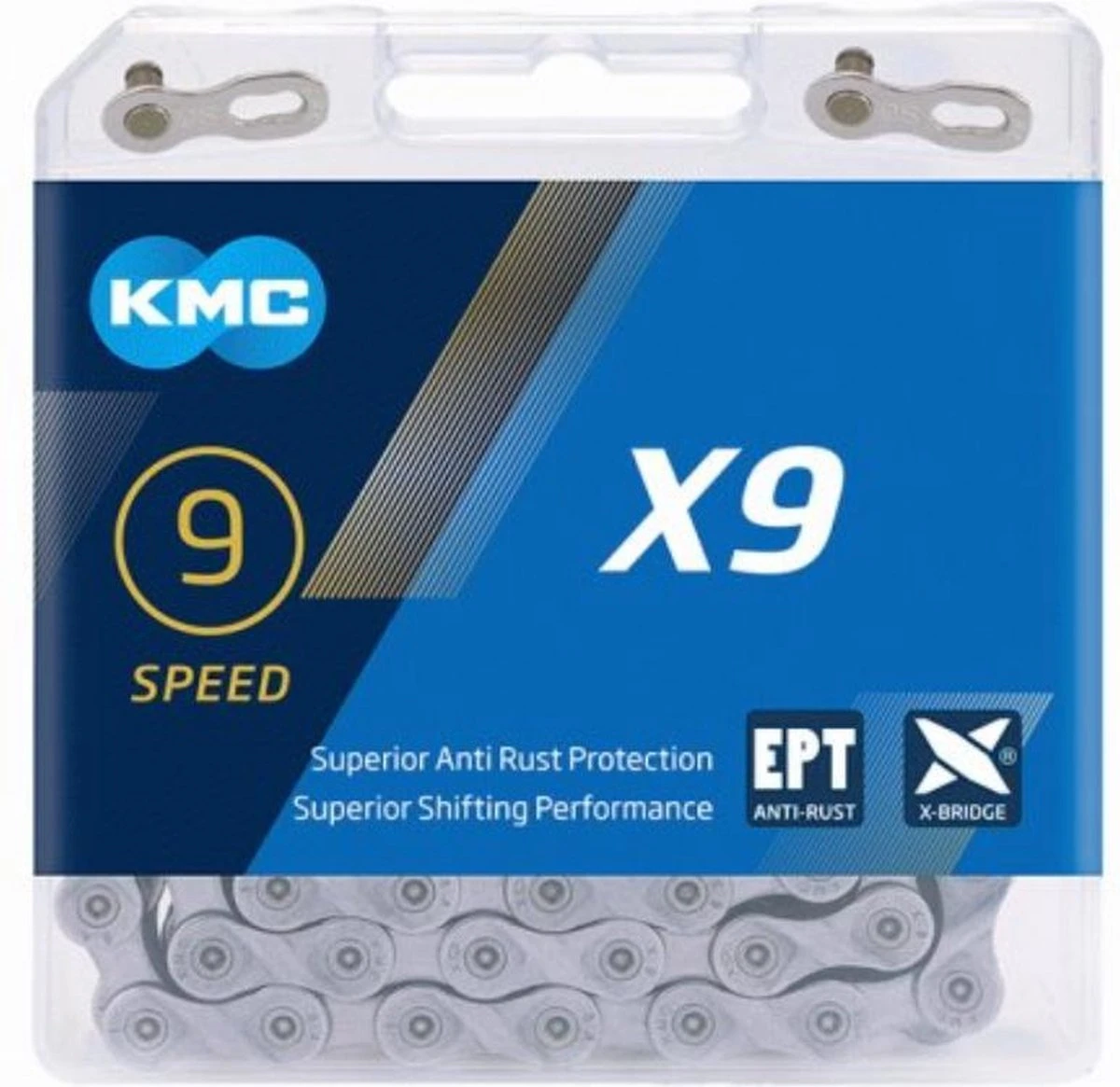 Dit is de nieuwe KMC 9 speed zilvere anti roest fietsketting. Deze ketting weegt 288 gram en bestaat uit 114 schakels. De ketting wordt standaard geleverd met een Missinglink. De ketting is geschikt voor Shimano, Campagnolo en Sram.