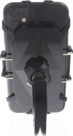 Deze telefoonhouder klemt de telefoon aan de zijkant en met elastiek in de hoeken waardoor deze houder extra veilig in gebruik is.