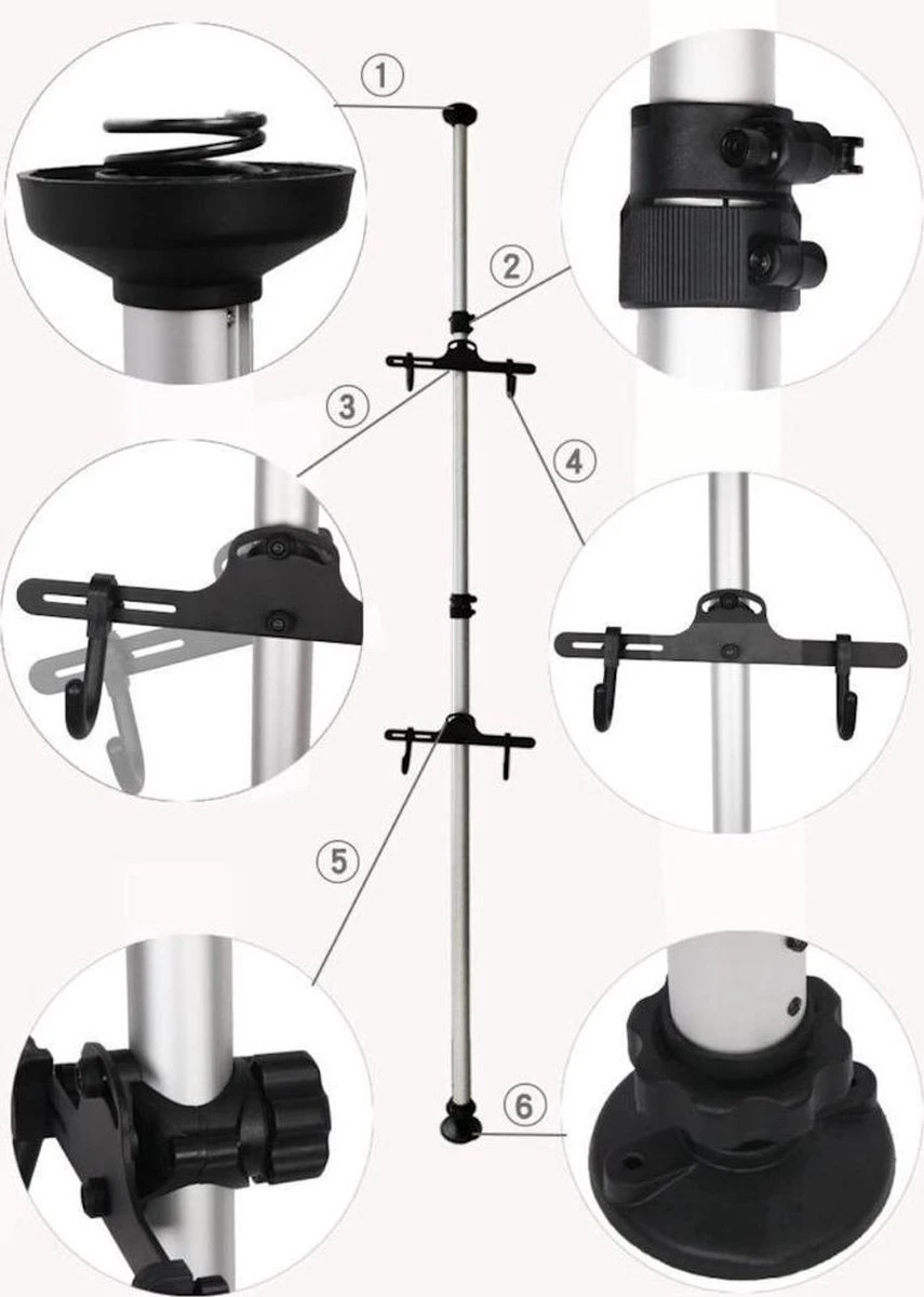 Na het klemmen tussen de vloer en het plafond moeten de houders in de daarvoor bestemde klemmen gezet worden. Als laatste moeten de haken bevestigd worden, deze moeten worden vastgeschroefd. U ontvangt dus een fietsenhouder waarin u makkelijk en op ruimtebesparende manier uw 2 fietsen kan opbergen. De houder is geschikt voor 2 fietsen met een max. draagvermogen van 40 kilo. De montage is snel en eenvoudig.