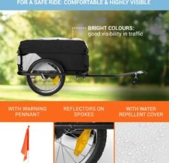 De fiets-aanhanger Mountee van DURAMAXX is uw specialist als het gaat om het verplaatsen van grote ladingen met de fiets – naar de supermarkt, op de weg in de tuin, naar de volgende picknick of zelfs een grotere fietstocht. De 130-liter grote laadruimte zorgt ervoor dat er heel wat bagae worden meegenomen. Daarvoor zorgt het stabiele stalen buizenframe. Geen vervelende autoritten meer want voor korte transportafstanden gebruikt u nu de DURAMAXX Mountee fiets-aanhanger: Om uzelf te redden van de stressvolle zoektocht naar een parkeerplaats, verkeersopstoppingen te verminderen en uw conditie te verbeteren. De lading wordt met een nylonhoes die over het frame gespannen in geval van regen.