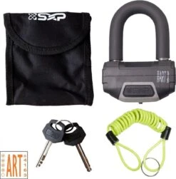 Het schijfremslot van SXP is een zeer makkelijk te gebruiken slot op de schijfrem, waardoor een motor of scooter beveiligd kan worden tegen diefstal. Door het ART 4 keurmerk is het schijfremslot goedgekeurd voor een diefstalverzekering van scooters en brommers. Ook is het slot goedgekeurd voor de meeste diefstalverzekeringen voor motoren. Informeer echter wel altijd naar de specifieke voorwaarden die de verzekeraar hanteert. Door het compacte formaat van het SXP schijfremslot is het slot gemakkelijk op te bergen in een jaszak. Hierdoor kan de motor of scooter op ieder gewenst moment worden beveiligd tegen diefstal. Het SXP slot wordt standaard geleverd met handig opbergtasje en reminderkabel.