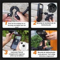 Het in de hand houden van je telefoon tijdens het fietsen is erg onhandig, gevaarlijk en sinds kort ook verboden. Toch is het erg fijn als je je telefoon tijdens het fietsen in het zicht hebt om bijvoorbeeld de routeplanner te zien of om je muziek te bedienen. Met dit nieuwe model kan je je telefoon zorgeloos bedienen tijdens het fietsen, rijden op de scooter/motor of tijdens het wandelen met de kinderwagen.