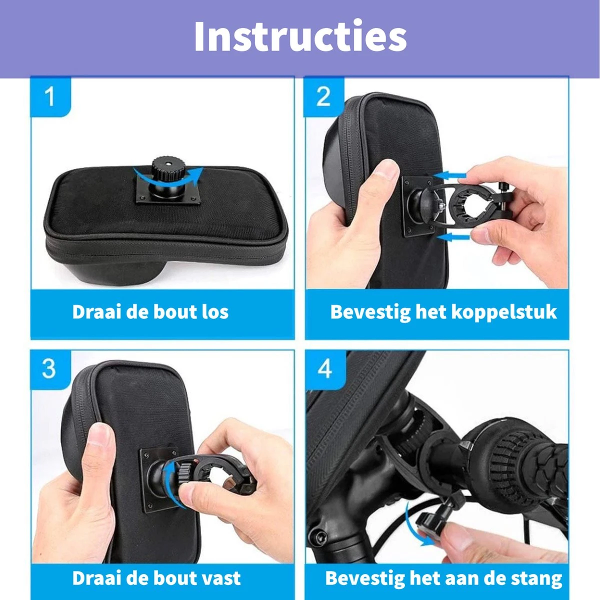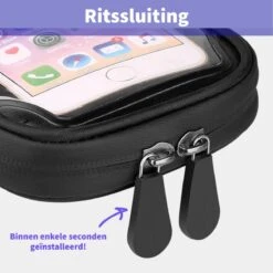 Plaats je telefoon in de hoes, en sluit de flap zodat je telefoon goed strak zit. Zorg dat je telefoon strak tegen het transparante pvc zit, zodat je jouw telefoon goed kunt bedienen. De rits is afgedekt met een nylon bedekking, zodat er geen water in de hoes komt als het regent. En als u onderweg even stopt om ergens wat te drinken, dan maak je de hoes eenvoudig open met de ritssafsluiting.