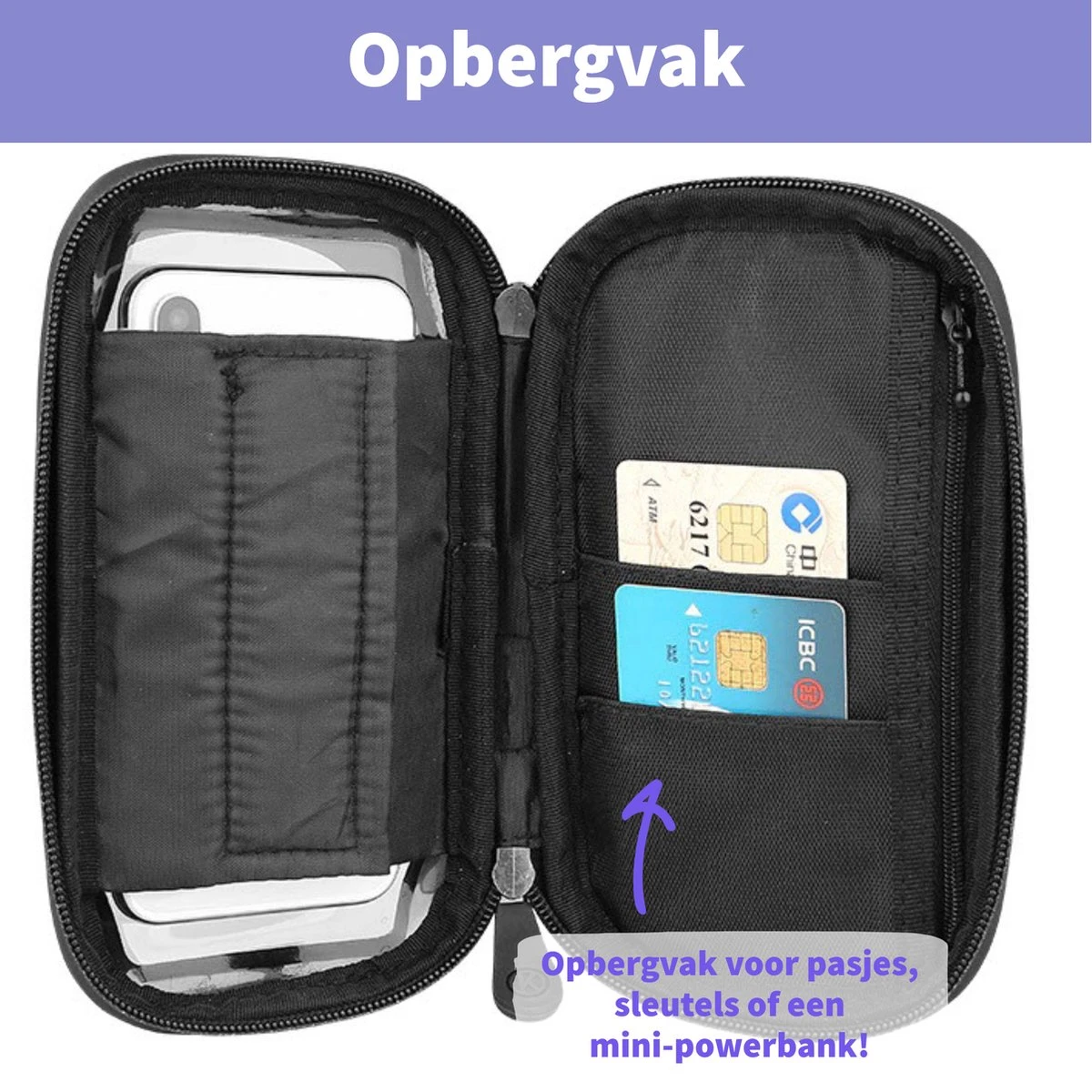 Met een extra opbergvak en driedimensionaal ontwerp ga je slim bepakt op weg. Zo is er nog ruimte voor een extra powerbank, pasjes, geld en een sleutelbos in jouw nieuwe fietstas en geniet je van optimaal gemak. Kun je op een zonnige dag het scherm niet goed zien? Jouw nieuwe smartphone houder voorkomt directe zonlicht reflectie!. Muziek luisteren tijdens het fietsen? Met een ingebouwde opening voor jouw headset kun je van jouw favoriete playlist tijdens een fietstocht genieten. De telefoonhouder kan 360 graden roteren. Hierdoor kun je jouw telefoon zowel in portret- als landschap stand gebruiken. Verzegelde dubbele ritssluiting Zorgt ervoor dat het water niet in de zak stroomt en maakt het gemakkelijk te openen en te sluiten.