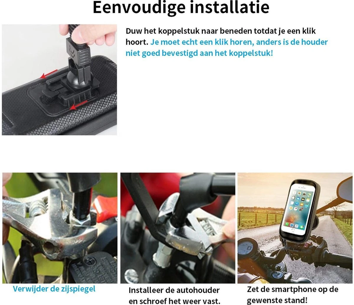 U bevestigt de beschermhoes op de houder door een eenvoudig klik systeem. Het kan zijn dat u veel kracht moet zetten om de hoes op de houder te klikken, maar dit is normaal. Het zorgt zo tevens voor een betrouwbare bevestiging. Wanneer u de fiets of motor parkeert, dan kunt u dankzij de rits snel uw smartphone eruit halen. De houder is zo gemaakt dat u deze kan bevestigen op de zijspiegel van uw motor, of eventuele andere stangen met een maximale diameter van 10 mm. Zie eventueel de installatie foto. Door middel van meegeleverde opvulling kunnen kleinere devices makkelijk “strakker” in de weersbestendige hoes worden geplaatst.