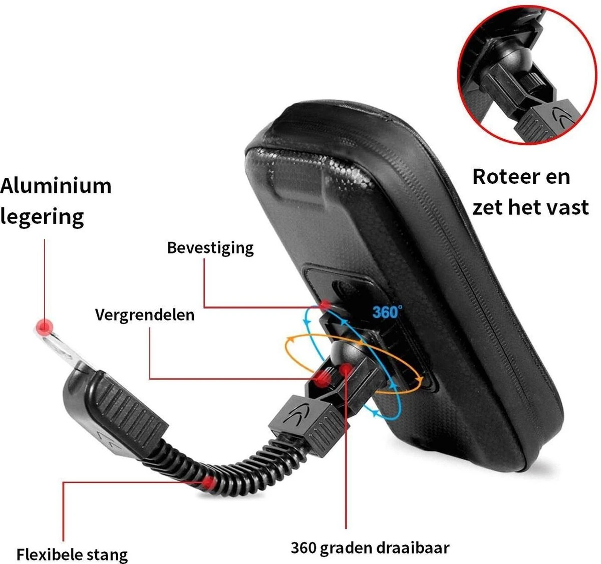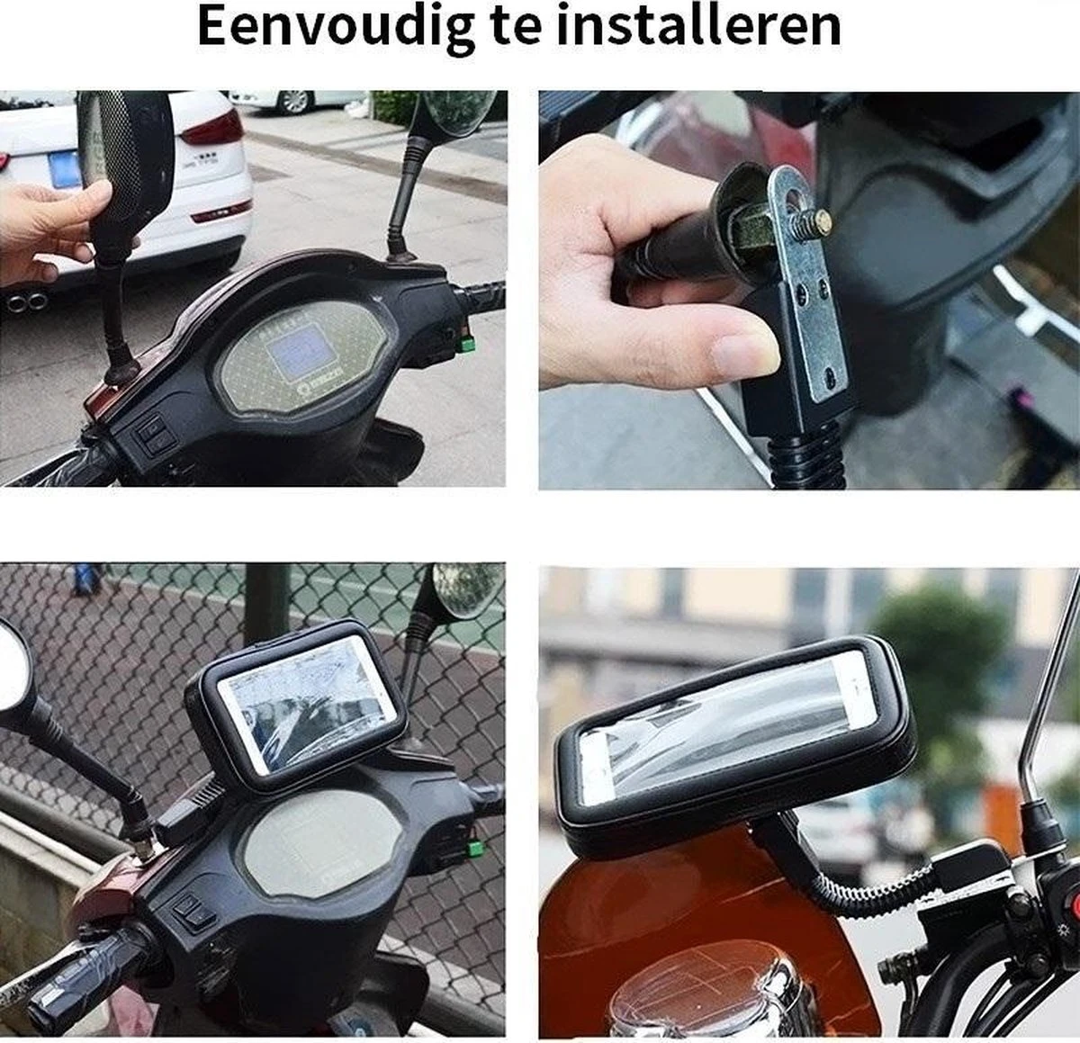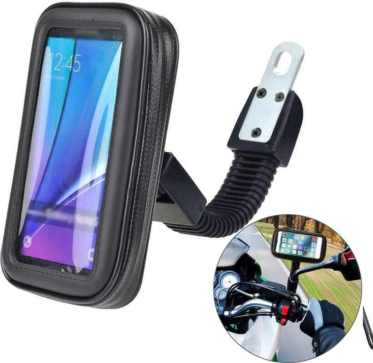 Wilt u uw smartphone meenemen op de motor of scooter en gebruiken voor o.a. navigatie? Dat kan met deze regenbestendige motorhouder. De houder maakt het mogelijk om de telefoon te gebruiken voor bijvoorbeeld navigatie onderweg, terwijl de hoes het toestel beschermt tegen onder andere regen en sneeuw. Het touchscreen blijft gewoon te bedienen met dank aan het aanraakgevoelige venster. De telefoonhouder is ook te gebruiken op een scootmobiel met achteruitkijkspiegel