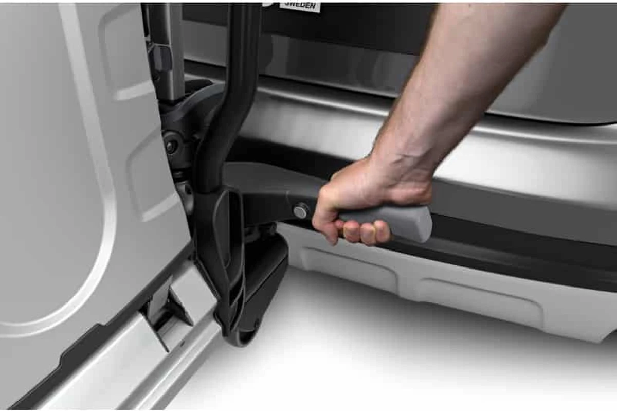 De Thule EasyFold XT 933 is een volledig opvouwbare, compacte en gemakkelijke te gebruiken fietsendrager geschikt voor het vervoeren van 2 fietsen. De Thule EasyFold XT 933 is zeer geschikt voor e-bikes gezien zijn laadvermogen van 60kg. Echter passen ook alle overige soorten fietsen perfect. De fietsendrager en de fietsen zijn alle af te sluiten. De fietsendrager stabiliseert zich op de trekhaakkogel wat montage op de trekhaak zeer gemakkelijk maakt. De fietsen worden vastgezet met de afneembare frameadapters welke zijn voorzien van een koppelbegrenzer zodat u weet dat de fietsen vast staan. De pompgespen met extra lange straps kunnen wielen van maximaal 4.7 vastzetten. De Thule EasyFold XT 933 is kantelbaar door middel van het voetpedaal. Kantelen kan tevens met de fietsen op de Thule EasyFold XT 933 wat de toegang tot de kofferruimte vergemakkelijkt. In opgevouwen staat is de Thule EasyFold XT 933 handig te vervoeren door de geintegreerde handgrepen.