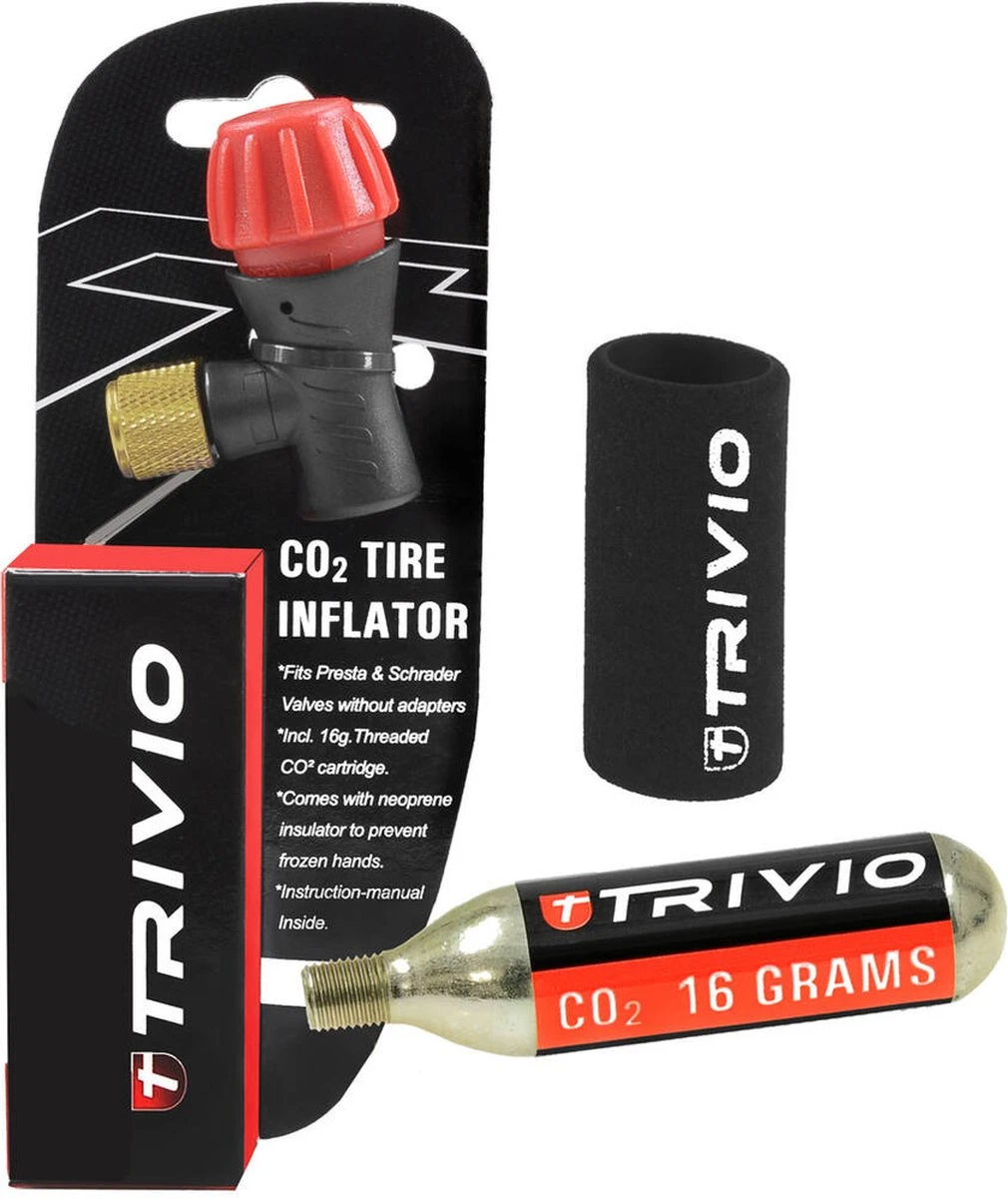 Deze Trivio CO2-patronenhouder is een zeer handige gadget voor iedere sportieve fietser. Geen rammelende patronen meer in je achterzak of tool bidon! Bevestig deze houder tussen het frame van uw fiets en de bidonhouder zodat de patronen netjes naast de bidon hangen. de houder wordt geleverd incl. CO2 adaptor en patroon. Deze Trivio CO2 patronen helpen je steeds uit de nood! Ze zijn voorzien van universele schroefdraad zodat elke ventieladapter kan bevestigd worden. Met een gewicht van 16 gram bieden deze patronen voldoende druk om een racefietsband hard te zetten. Pomp uw fietsband snel en zorgeloos op met deze CO2 patronen van Trivio. Geniet van een zorgeloze rit met Trivio. Dit pakket bevat een regelbare ventieladapter, CO2 patroon en een neopreen huls.