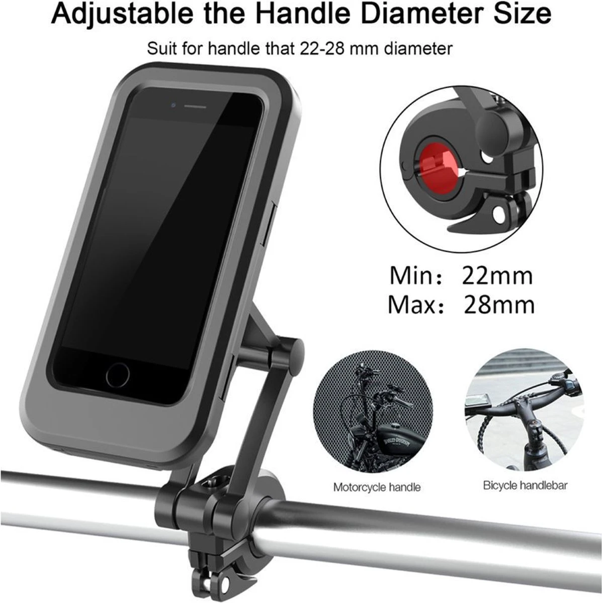 - Eenvoudige installatie op het stuur: compatibel met het stuur van motorfietsen, fietsen, loopbanden, kinderwagens met een diameter van 0,9 “(22 mm) tot 1,1” (28 mm). De mobiele telefoonhouder voor motorfietsen is eenvoudig te monteren, geen gereedschap nodig, plaats de houder gewoon op het stuur van de fiets en zet de moer vast. De klem is ontworpen om snel te monteren of te demonteren en je hebt geen ander gereedschap nodig.