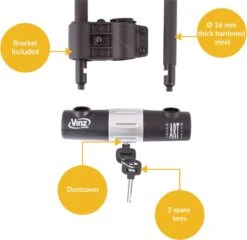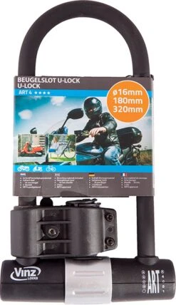 Dit beugelslot van VINZ is een perfect slot om een tweewieler te beveiligen tegen diefstal. Daarnaast is het slot ook erg makkelijk in het gebruik. Het slot kan gebruikt worden voor zowel motoren als fietsen. Bij een motor is het slot door het wiel te gebruiken. Een fiets kan eenvoudig worden vastgemaakt aan een lantaarnpaal of hek. Als een fiets is bevestigd aan een vast object, is de kans op diefstal een stuk kleiner. Dit komt omdat de fiets niet kan worden opgetild en meegenomen. Het VINZ beugelslot is ART 4 goedgekeurd en daardoor geschikt voor de meeste diefstalverzekeringen van motoren. Bekijk eerst altijd goed de specifieke voorwaarden van de desbetreffende verzekering.