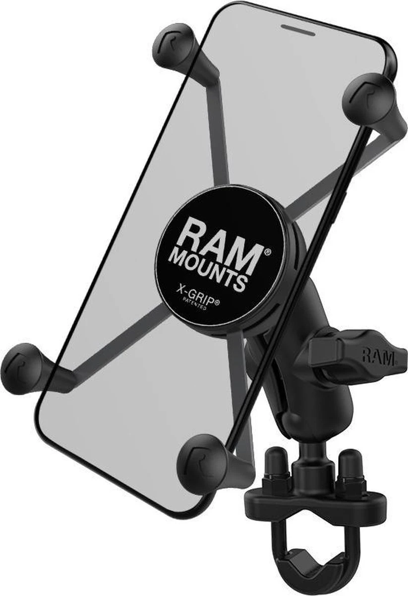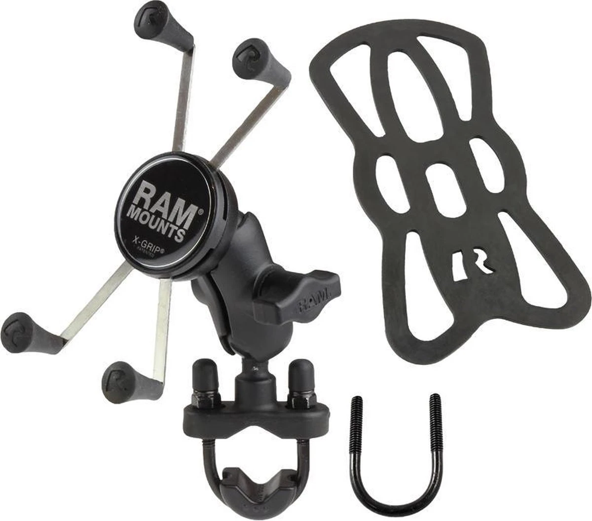 RAM-B-231ZU: Stalen zwarte U-beugel met rubberen B-kogel. voor stuurstangen tussen 1.3 en 3.2 cm diameter incl. rubberen beschermdopjes voor schroefdraad uiteinden. RAM-B-201U-A: korte 6 cm Double socket arm voor B-kogel. Maximaal flexibel en snel instelbaar. Gepoedercoat aluminium